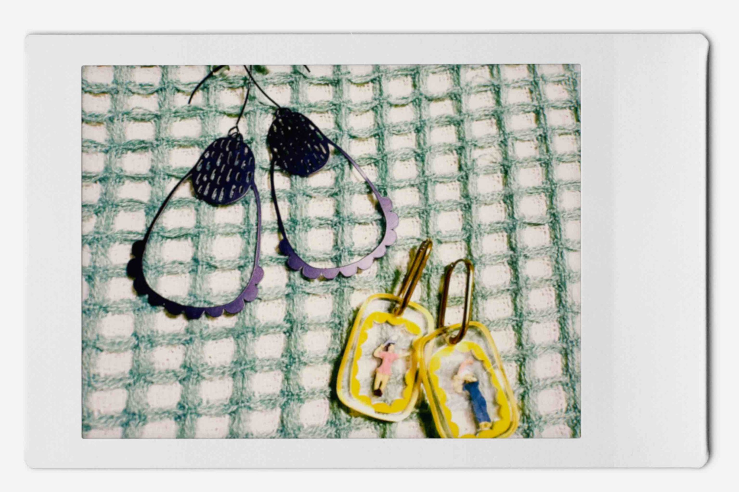 黄色い樹脂のピアスは「FUNKY FUN YOU」というブランドのもの。